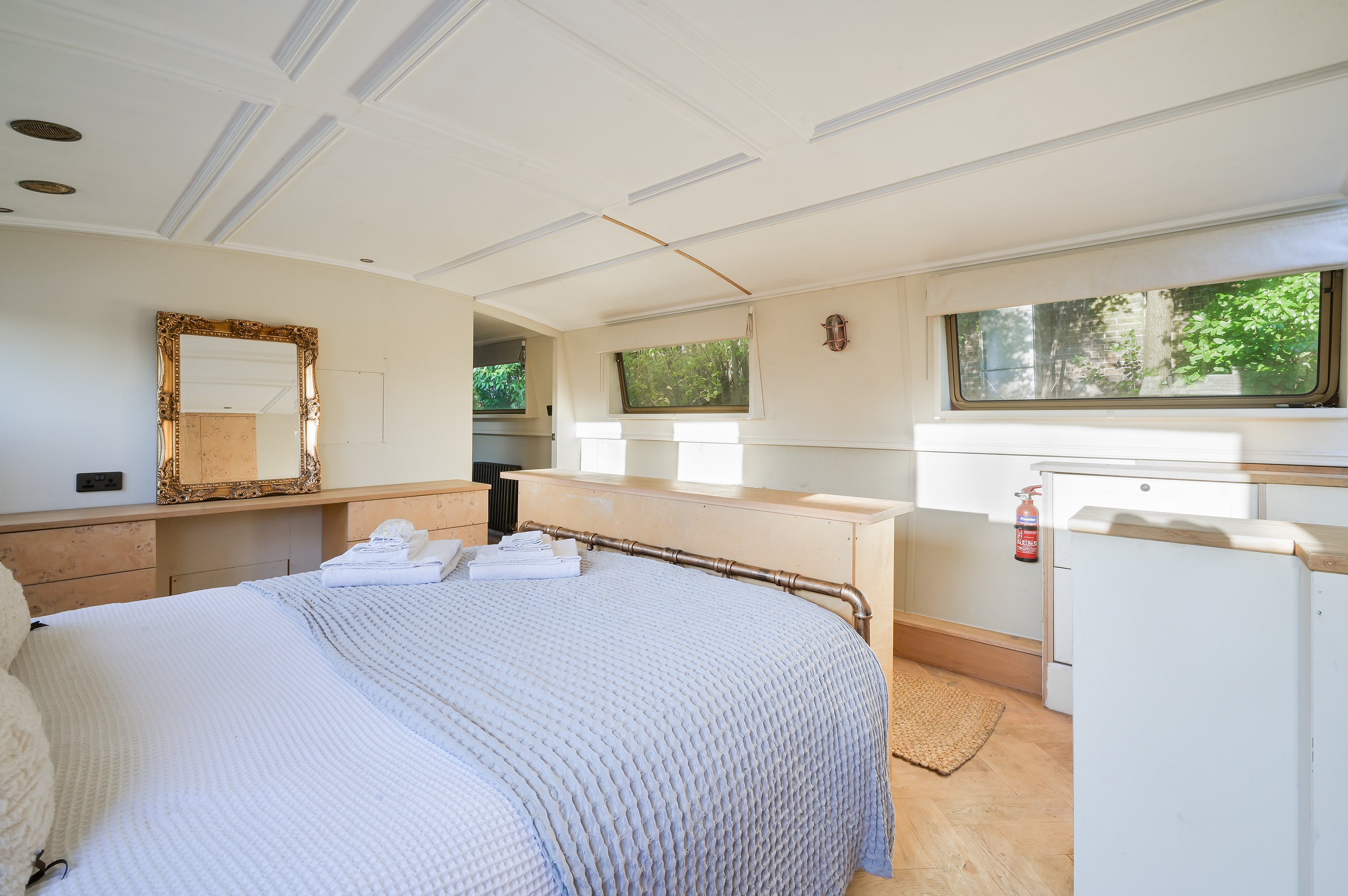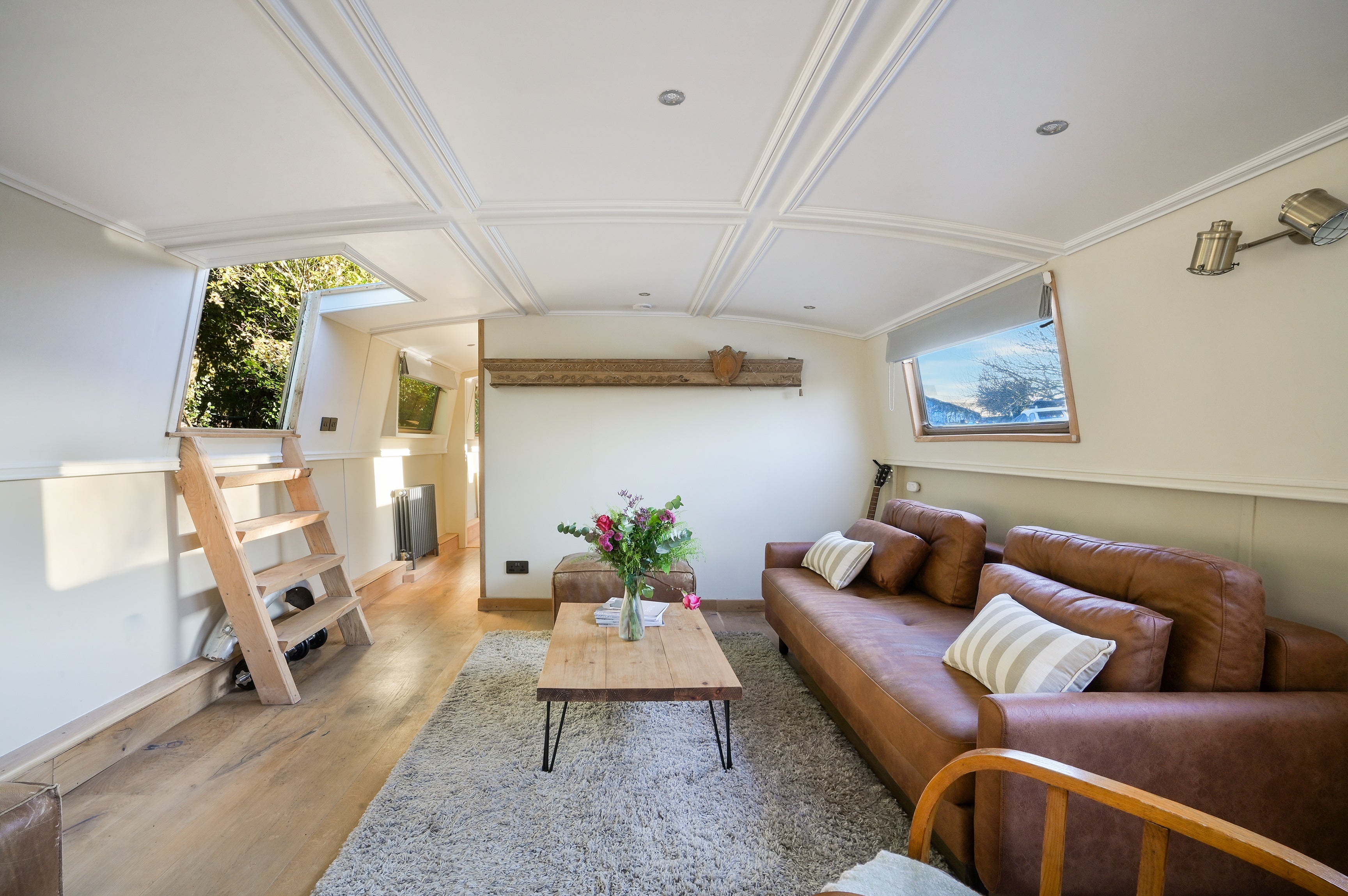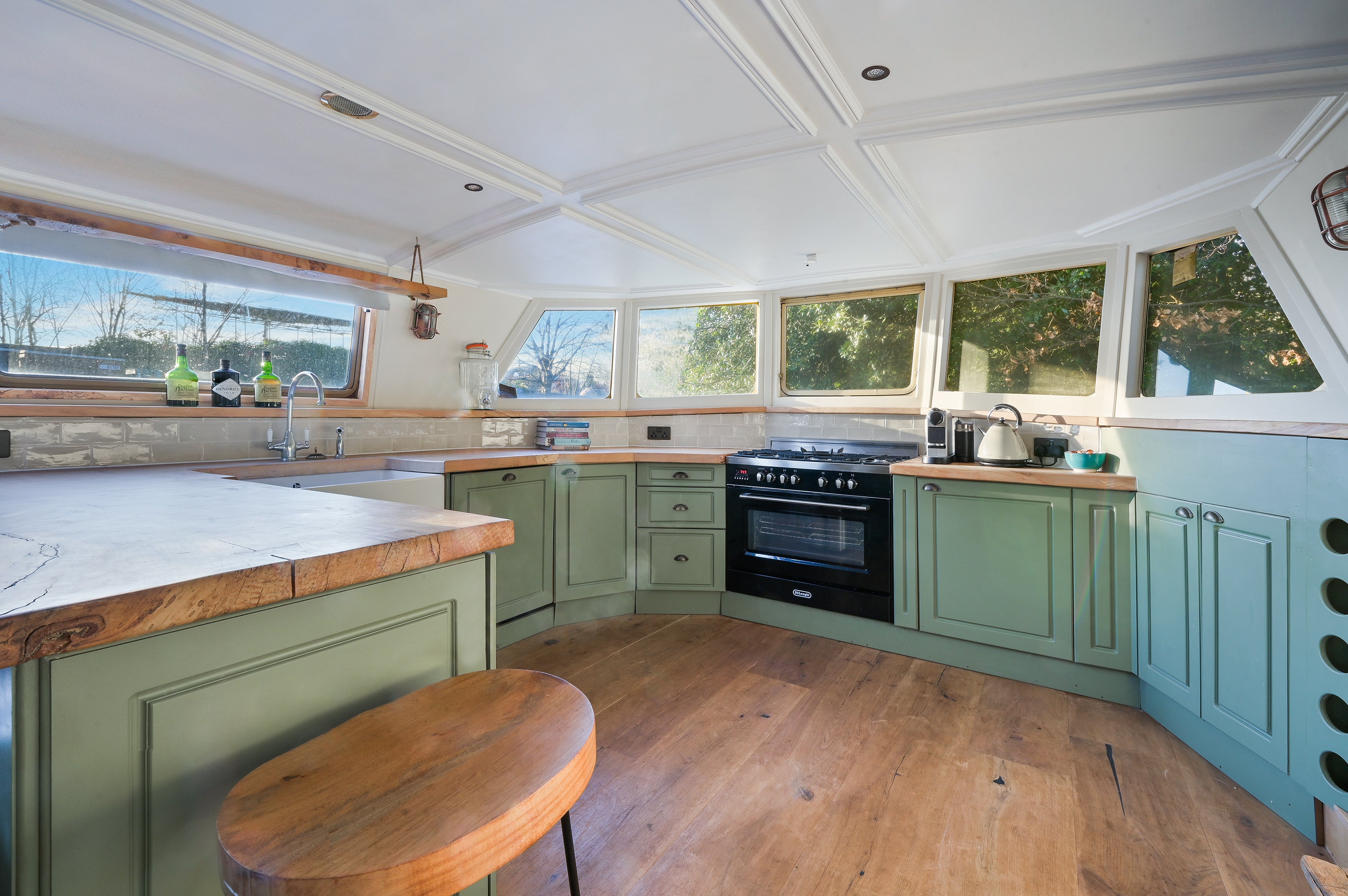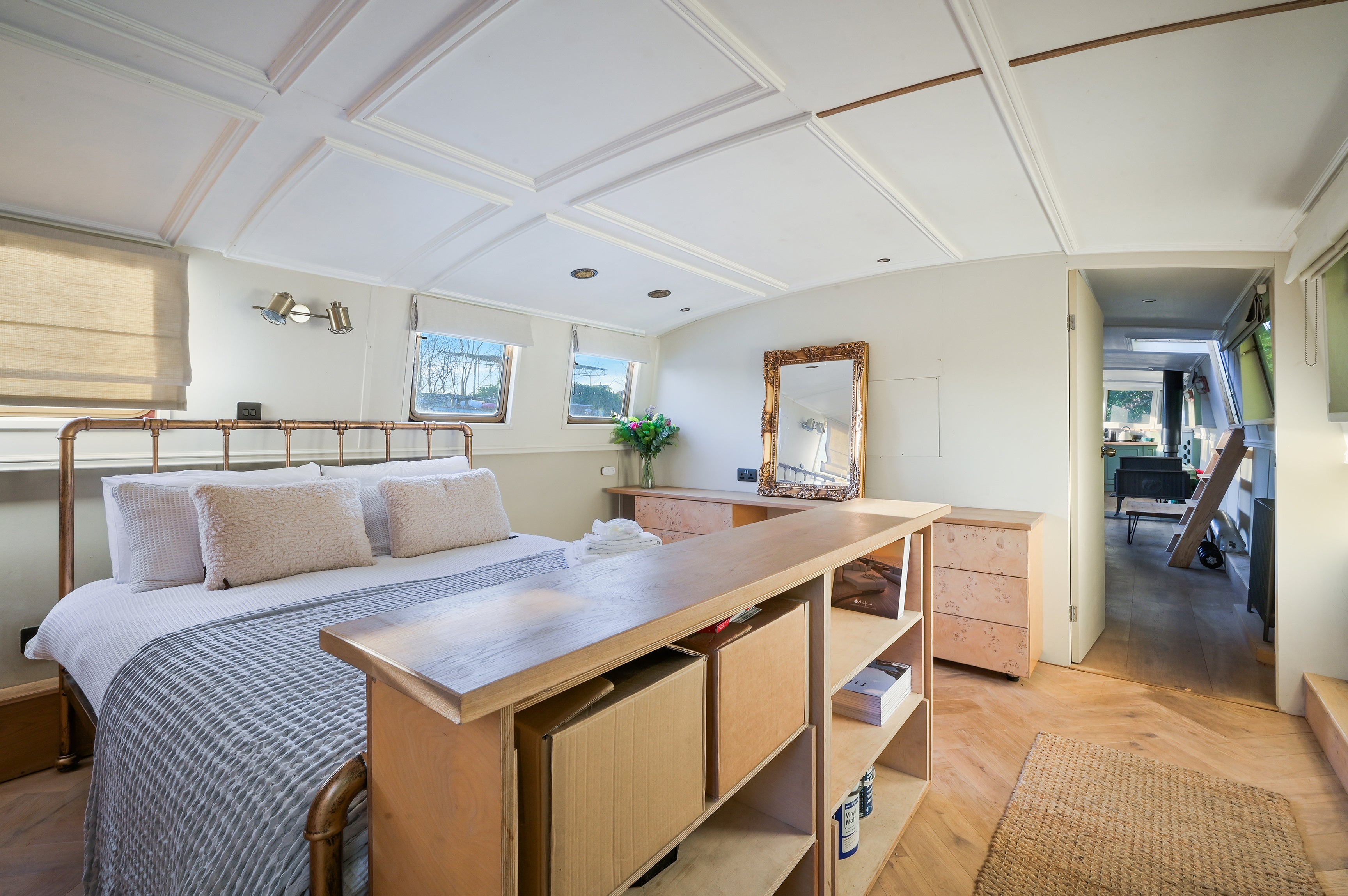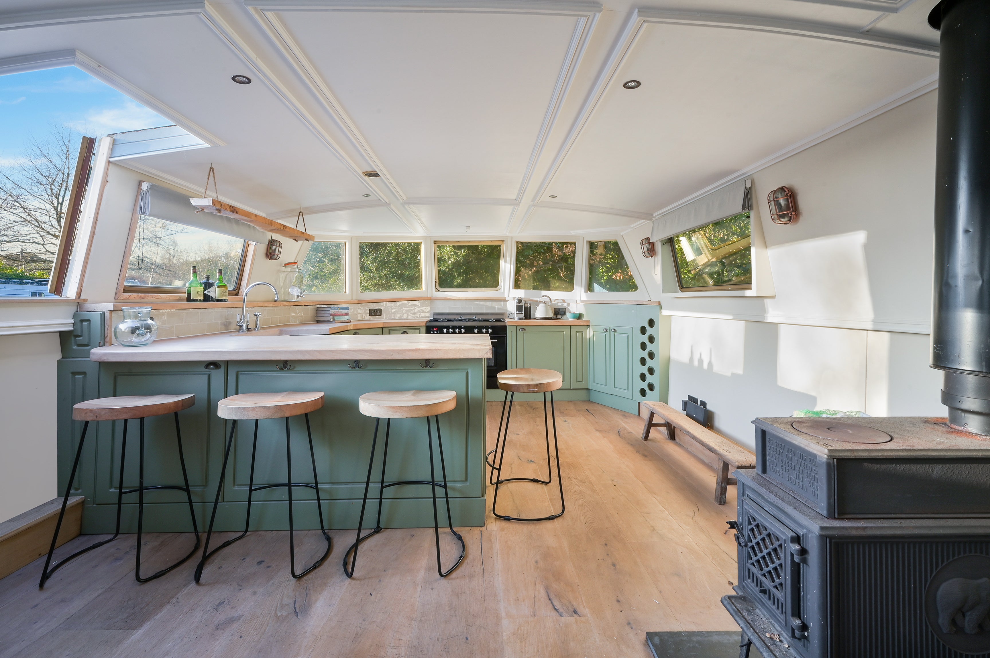 This charming floating home combines contemporary comforts with the unique character of canal-side living. The generous open-plan interior has been thoughtfully redesigned, offering a bright and spacious living area with bespoke finishes, modern flooring, and large windows that flood the space with natural light. The newly fitted kitchen boasts sleek cabinetry and high-quality appliances, perfect for both everyday living and entertaining.