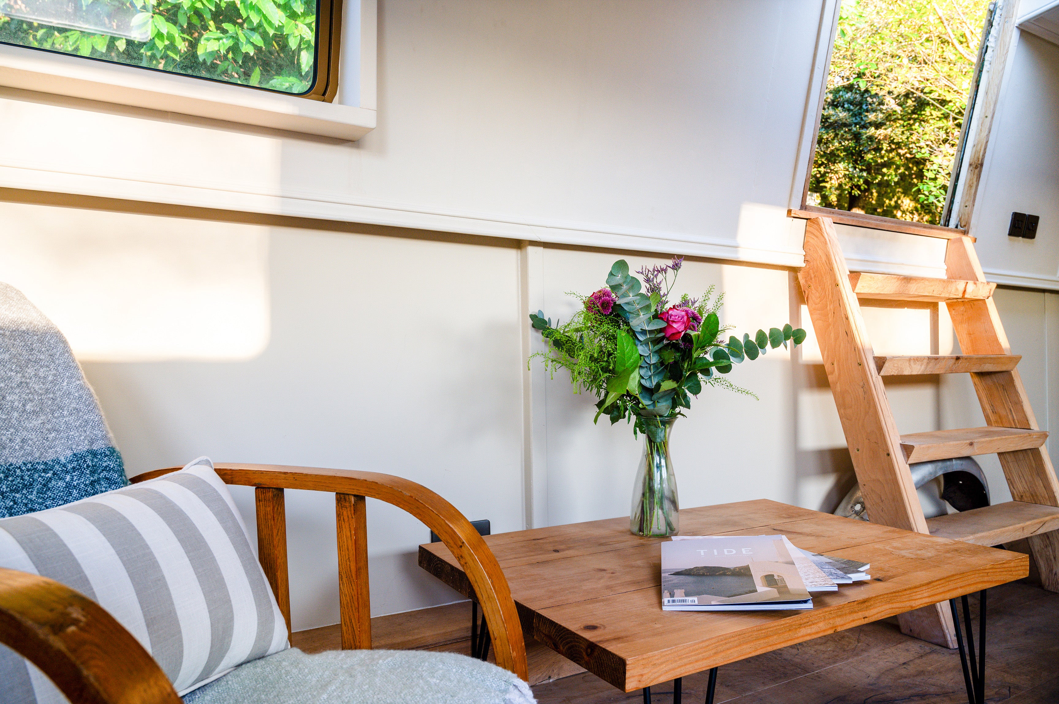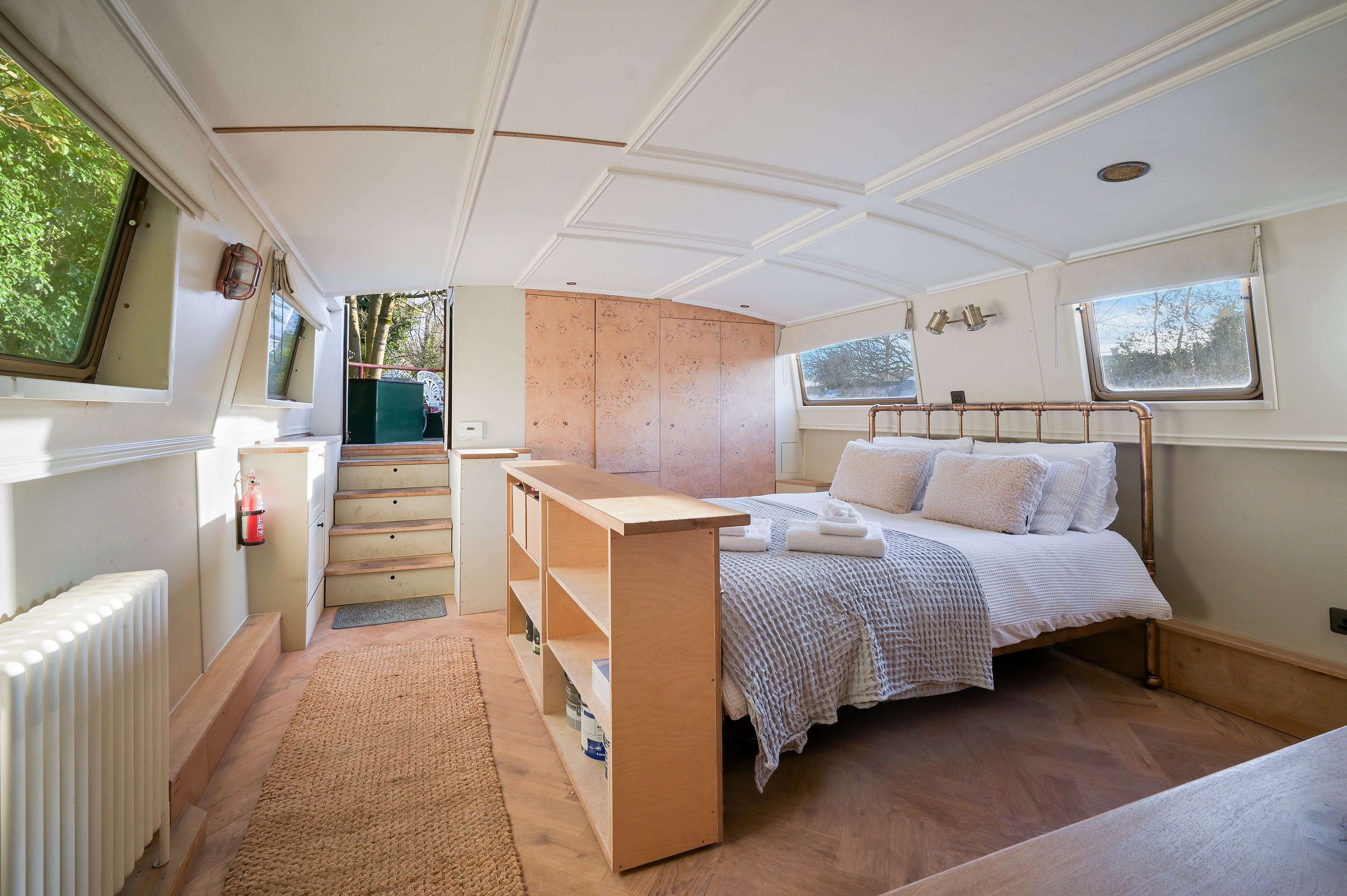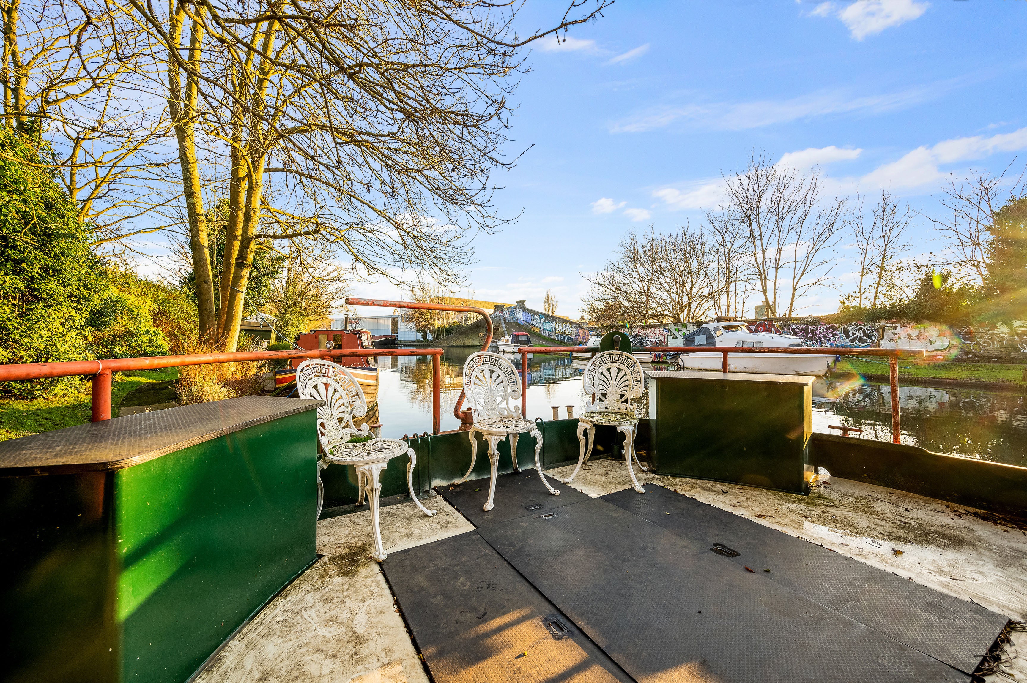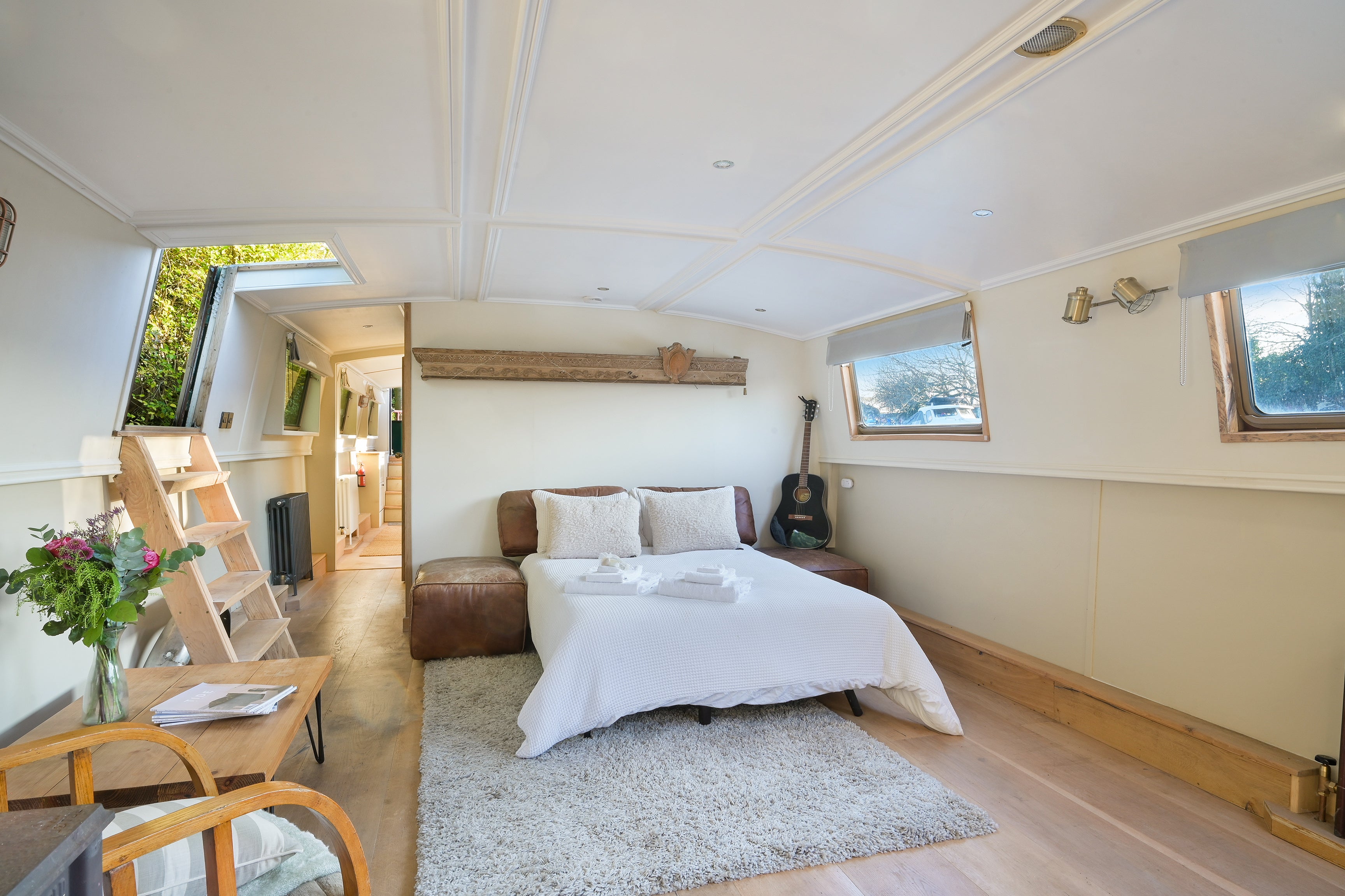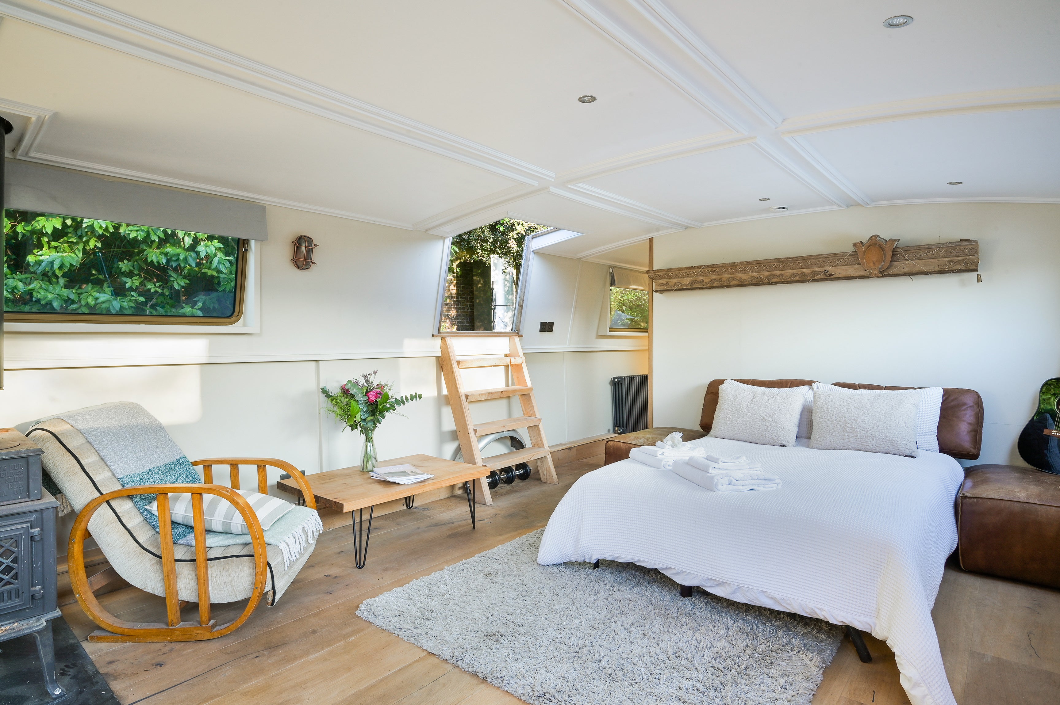 This charming floating home combines contemporary comforts with the unique character of canal-side living. The generous open-plan interior has been thoughtfully redesigned, offering a bright and spacious living area with bespoke finishes, modern flooring, and large windows that flood the space with natural light. The newly fitted kitchen boasts sleek cabinetry and high-quality appliances, perfect for both everyday living and entertaining.